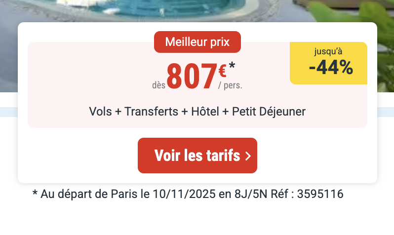 A noter : les prix sont corrects au moment de la publication, sur la base des exemples de dates fournis, et sont soumis à des fluctuations, en fonction des disponibilités.