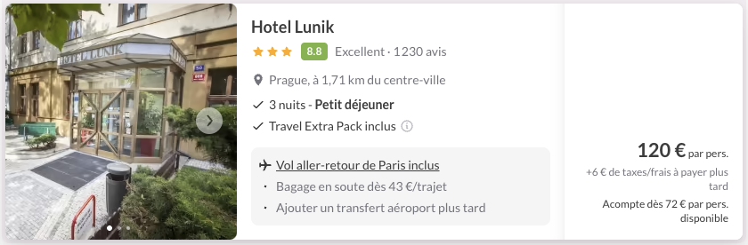 A noter : les prix sont corrects au moment de la publication, sur la base des exemples de dates fournis, et sont soumis à des fluctuations, en fonction des disponibilités.