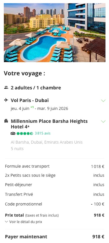 Le prix inclut les vols A/R, les transferts privés, l'hébergement 45, le petit-déjeuner ainsi que 4 activités : la visite du Burj Khalifa, un safari dans le désert suivi d’un dîner et d’un spectacle de danse, une entrée pour le parc aquatique de l'hôtel Atlantis The Palm et une entrée pour l'aquarium Lost Chamber.