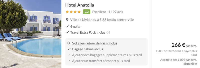 Je vous ai concocté 5 jours à destination de Mykonos dès 266€ par personne. Le prix comprend les vols A/R directs ainsi que l'hébergement 4 * avec piscine.