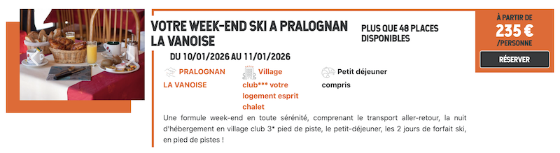 Câest le bon plan parfait pour sâĂ©vader le temps dâun weekend : budget maĂźtrisĂ©, organisation simplifiĂ©e, transport inclus, forfaits compris⊠Il ne vous reste plus quâĂ chausser vos skis et filer Ă lâabordage des pistes !