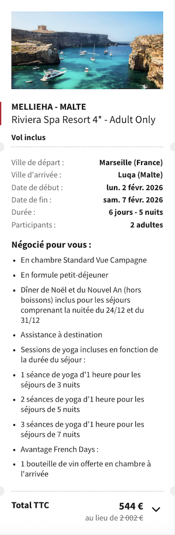 Aujourd'hui, c'est un séjour signé Voyage Privé que je vous propose pour égayer l'automne ou l'hiver : 6 jours dans un bel hôtel avec centre de spa et deux piscines, en front de mer sur la baie de Mellieha.
