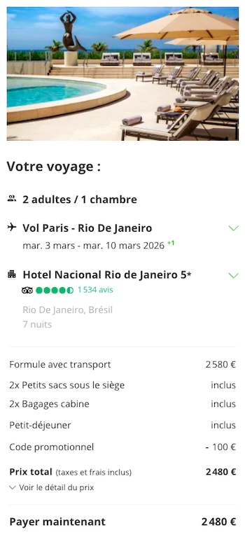 Le prix inclut les vols A/R depuis plusieurs villes et les petits-déjeuners. Vous pouvez payer en 2x ou 4x afin d'étaler les échéances.