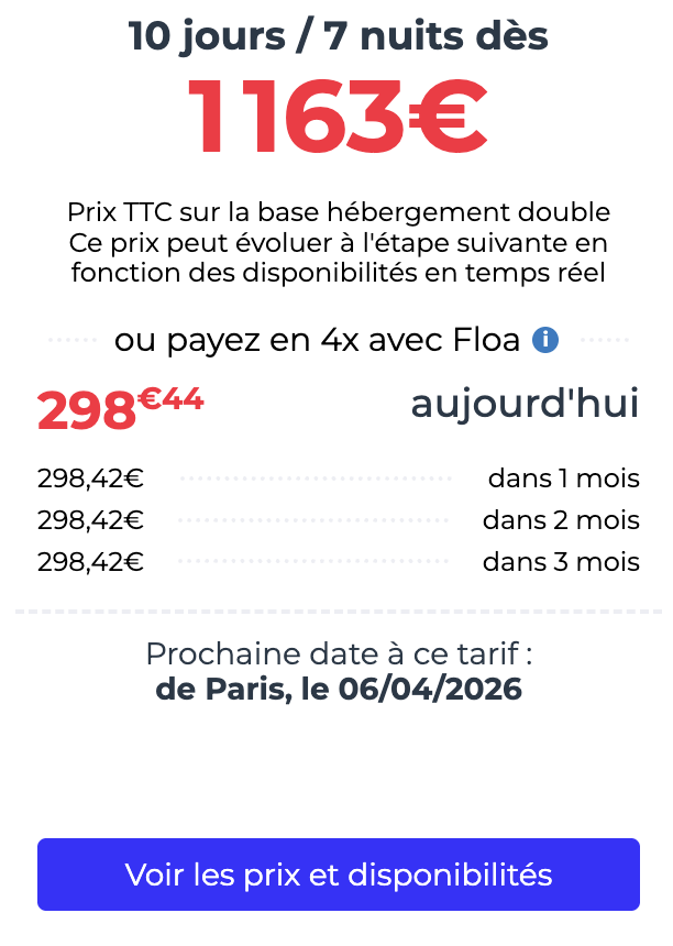 Le paiement en 4x est également possible. Des départs sont disponibles depuis de nombreuses villes françaises, entre octobre 2025 et novembre 2026.
