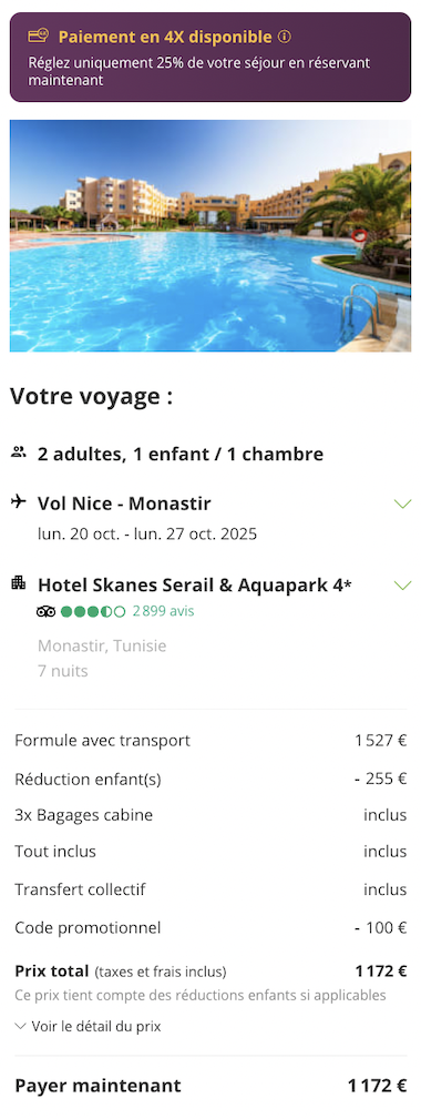 A noter : les prix sont corrects au moment de la publication, sur la base des exemples de dates fournis, et sont soumis à des fluctuations, en fonction des disponibilités.