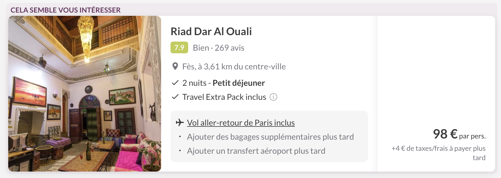 DÚs 98⏠p.p, vous profiterez du vol A/R ainsi que de l'hébergement en riad 3* bien noté avec petits-déjeuners.