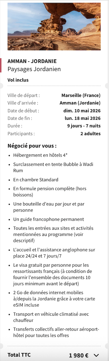 A noter : les prix sont corrects au moment de la publication, sur la base des exemples de dates fournis, et sont soumis à des fluctuations, en fonction des disponibilités.