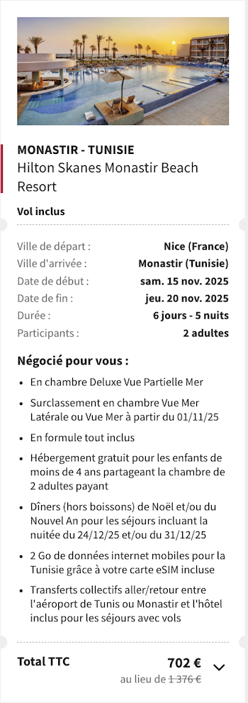 A noter : les prix sont corrects au moment de la publication, sur la base des exemples de dates fournis, et sont soumis à des fluctuations, en fonction des disponibilités.