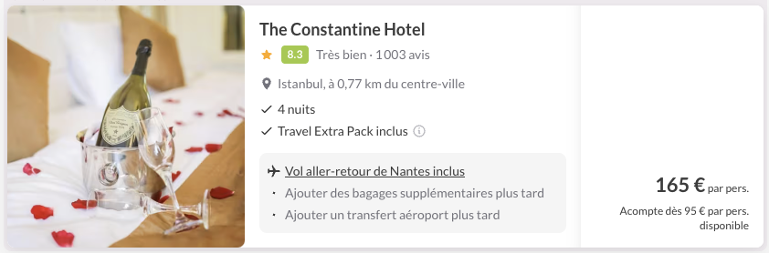 A noter : les prix sont corrects au moment de la publication, sur la base des exemples de dates fournis, et sont soumis à des fluctuations, en fonction des disponibilités.