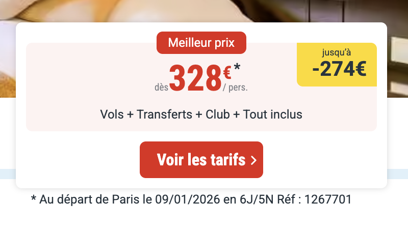A noter : les prix sont corrects au moment de la publication, sur la base des exemples de dates fournis, et sont soumis à des fluctuations, en fonction des disponibilités.