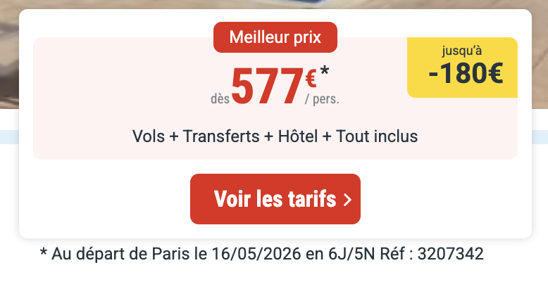 À noter : les prix sont corrects au moment de la publication, sur la base des exemples de dates fournis, et sont soumis à des fluctuations, en fonction des disponibilités.