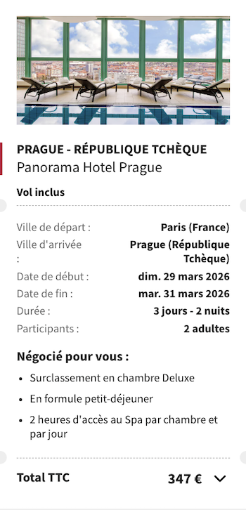 Exemple de séjour depuis Paris du 29 au 31 mars 2026 :