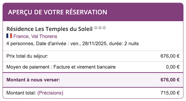 Le séjour comprend 2 nuits dans une résidence 3* au pied des pistes et le forfait de ski 2 jours pour le domaine Orelle/Val Thorens.