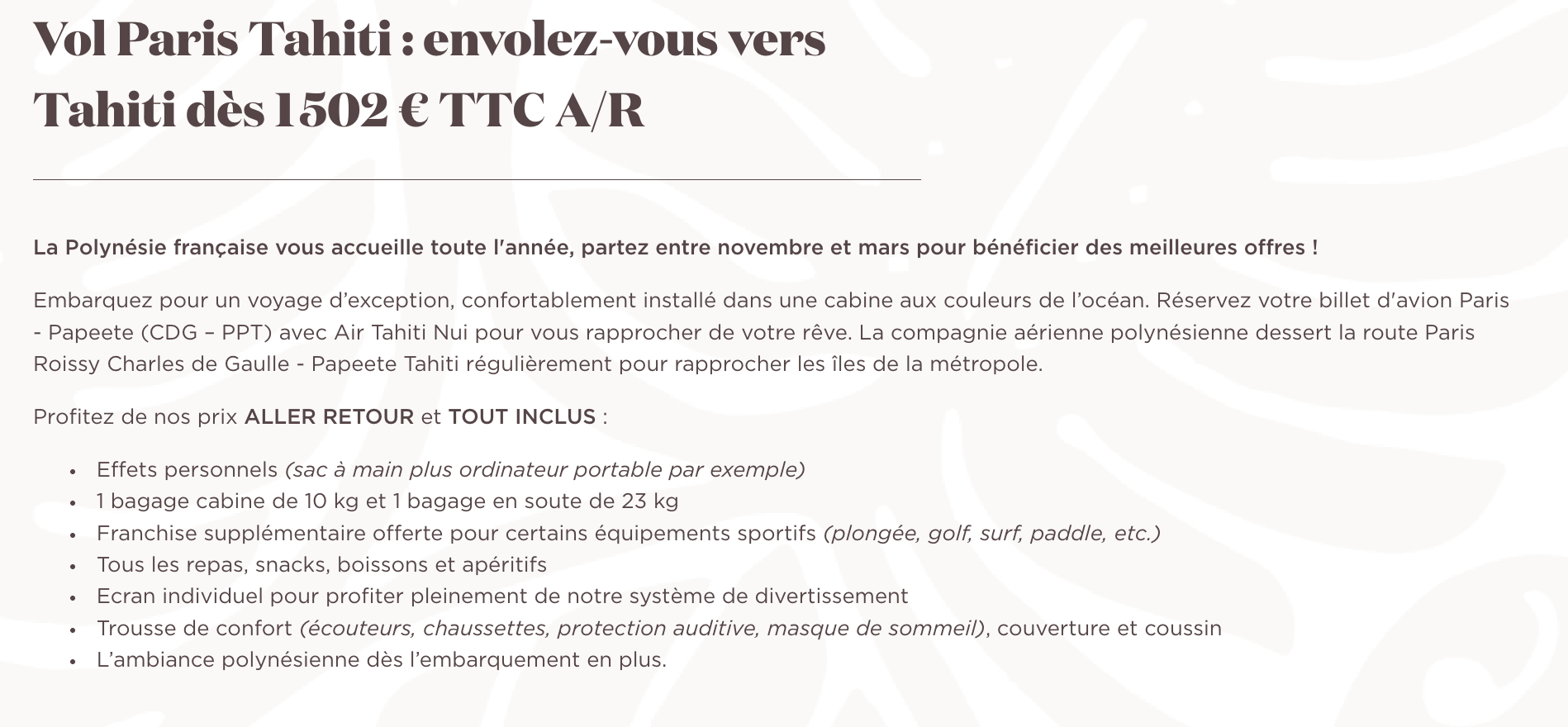 Valable uniquement sur le site internet airtahitinui.com et sur les vols opérés par Air Tahiti Nui