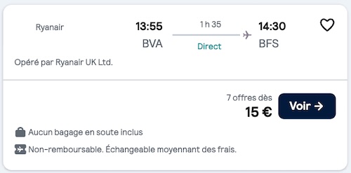 Exemple d'un vol Paris Beauvais-Belfast le 24 octobre 2025 :