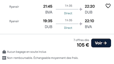 Depuis Paris Beauvais vers Dublin du 22 au 26 décembre 2025 :
