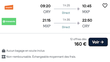 Depuis Paris Orly vers Milan du 23 au 26 décembre 2025 :