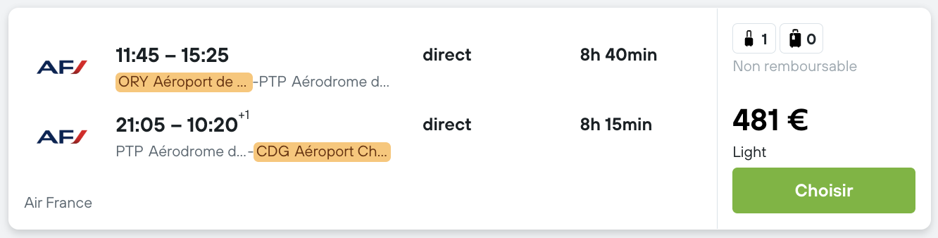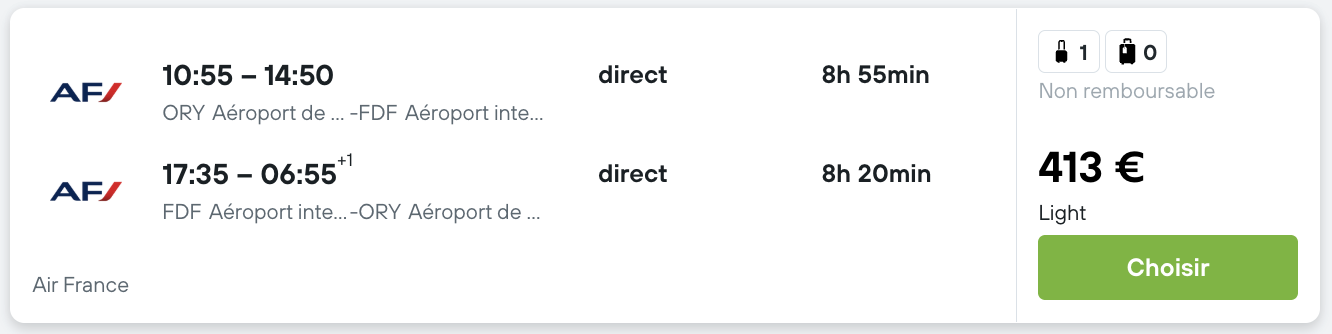 Exemple de vols vers la Guadeloupe du 8 au 24 décembre 2025 :