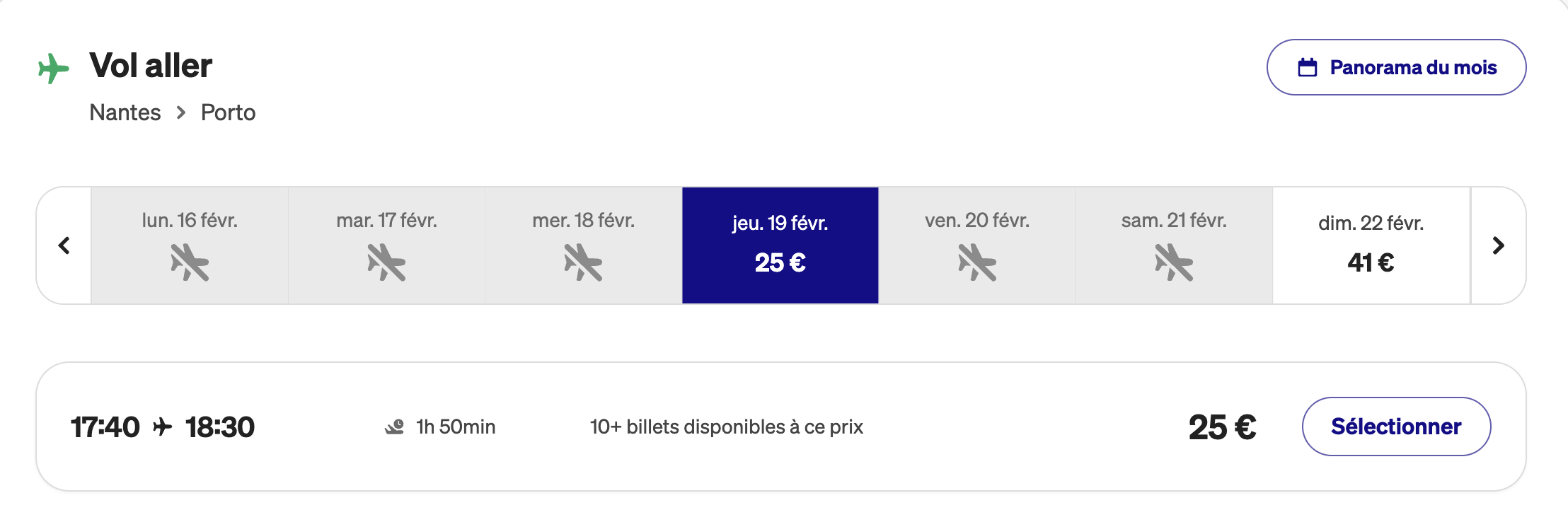 Exemple de vol Nantes - Porto le 19 février 2026 :