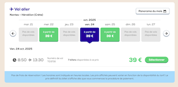 Exemple de vol A/S Nantes - Héraklion le 24 octobre 2025 (CrÚte) :