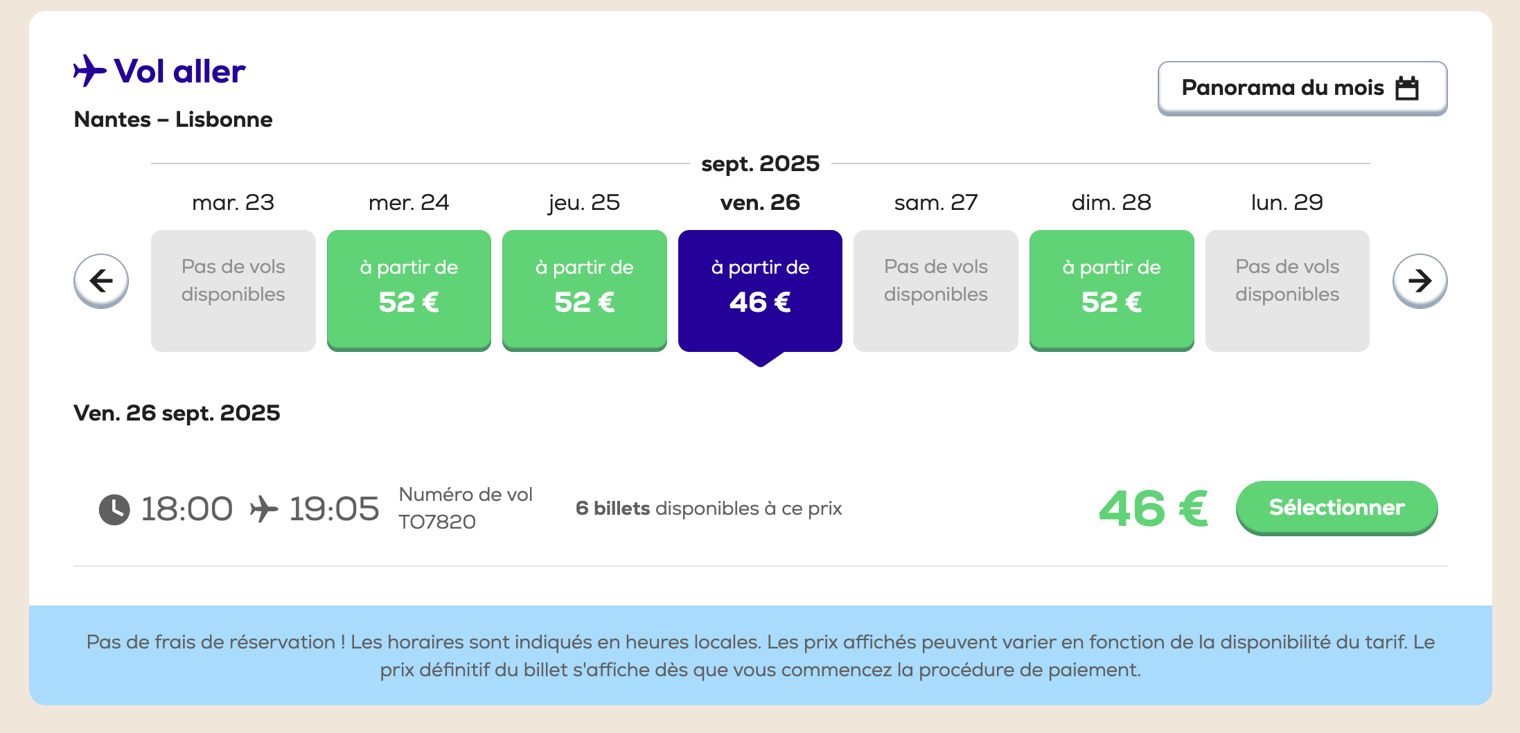Exemple de vol A/S Nantes - Lisbonne le 26 septembre 2025 :