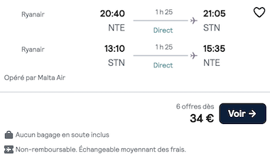 Exemple de vols depuis Nantes du 25 au 28 novembre 2025 :