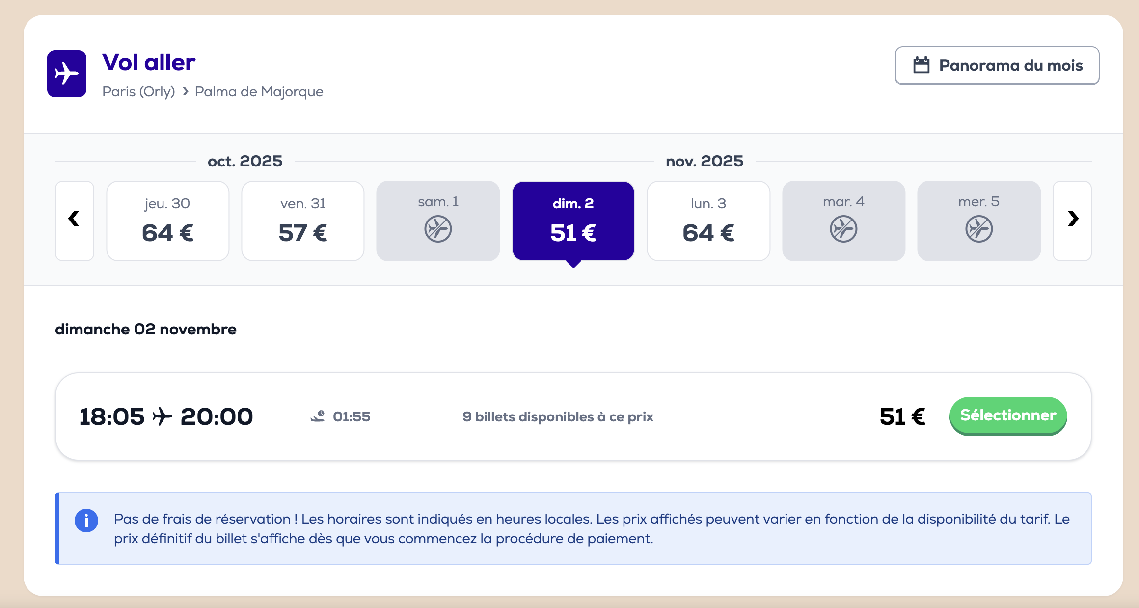 Pour vous y rendre, nous vous proposons des vols A/S dès 51€ avec la compagnie Transavia, filiale du groupe Air France/KLM. Plusieurs vols sont disponibles à ce prix en novembre.