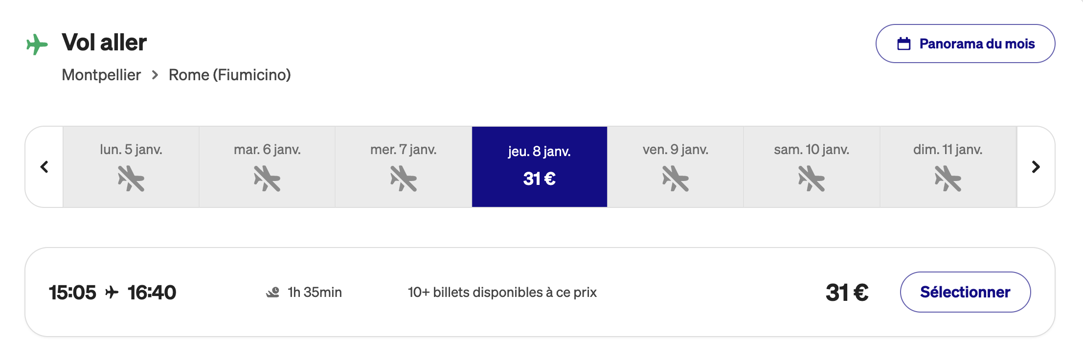 Exemple de vol Toulouse - Rome le 8 janvier 2026 :
